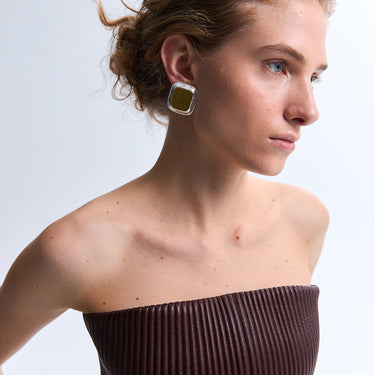 Кліпси, як варіант прикраси у портретній зоні для тих, хто не носить сережки. Із неоднорідною, нанесеною вручну емаллю фісташкового кольору в обрамленні натхненної епохою 60-80х квадратної форми із посрібленням. Підкреслюють каштанові очі, а блакитним та зеленим додають яскравості. Для мінімалістів — поєднання із каблучкою чи браслетом із тієї ж серії RESONANCE Pistachio, а для більш насичених образів додайте ще чокер.