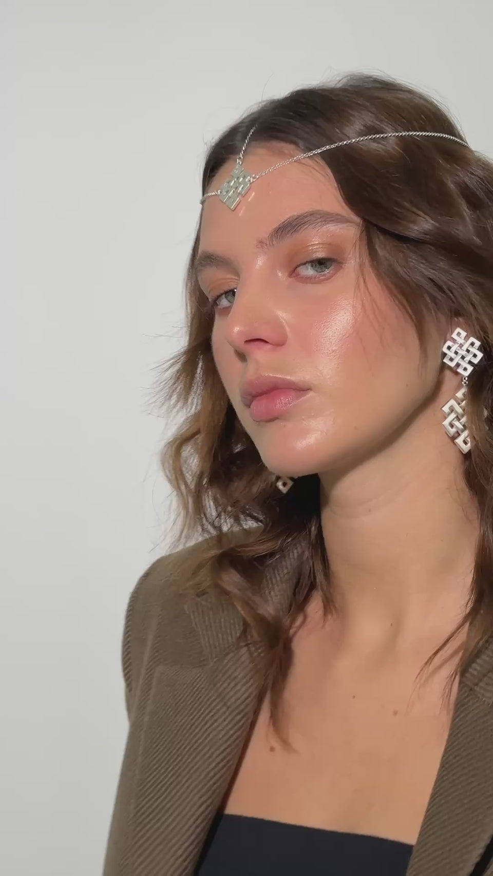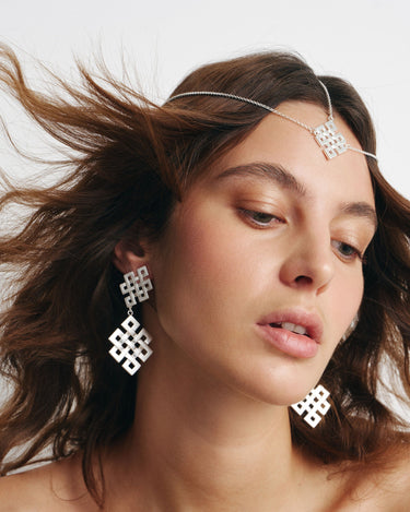 Сучасна інтерпретація оберега: head chain із вузлом нескінченності підкреслює індивідуальність і додає образу «того самого» акценту. Прикраса легко адаптується — регулюй посадку під вільне волосся, низький хвіст чи високу зачіску. Це деталь, яка працює і в денному мінімалізмі, і на вечірніх подіях.