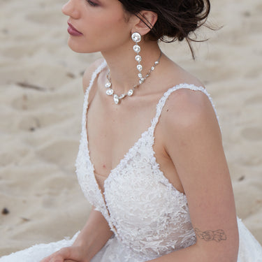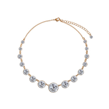 Кольє, яке працює як світловий прожектор для зони декольте. Кристали різного розміру утворюють м’яку хвилю блиску – від делікатних до акцентних, створюючи ефект дорогої, але легкої прикраси. Носіть його з маленькою чорною сукнею, білою сорочкою чи відкритим топом – у будь-якому варіанті воно моментально робить образ “вау”.