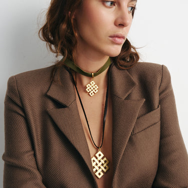 Графічний вузол на короткій посадці акцентує шию й додає ритму силуету. Добре працює з відкритими вирізами та сорочками.
