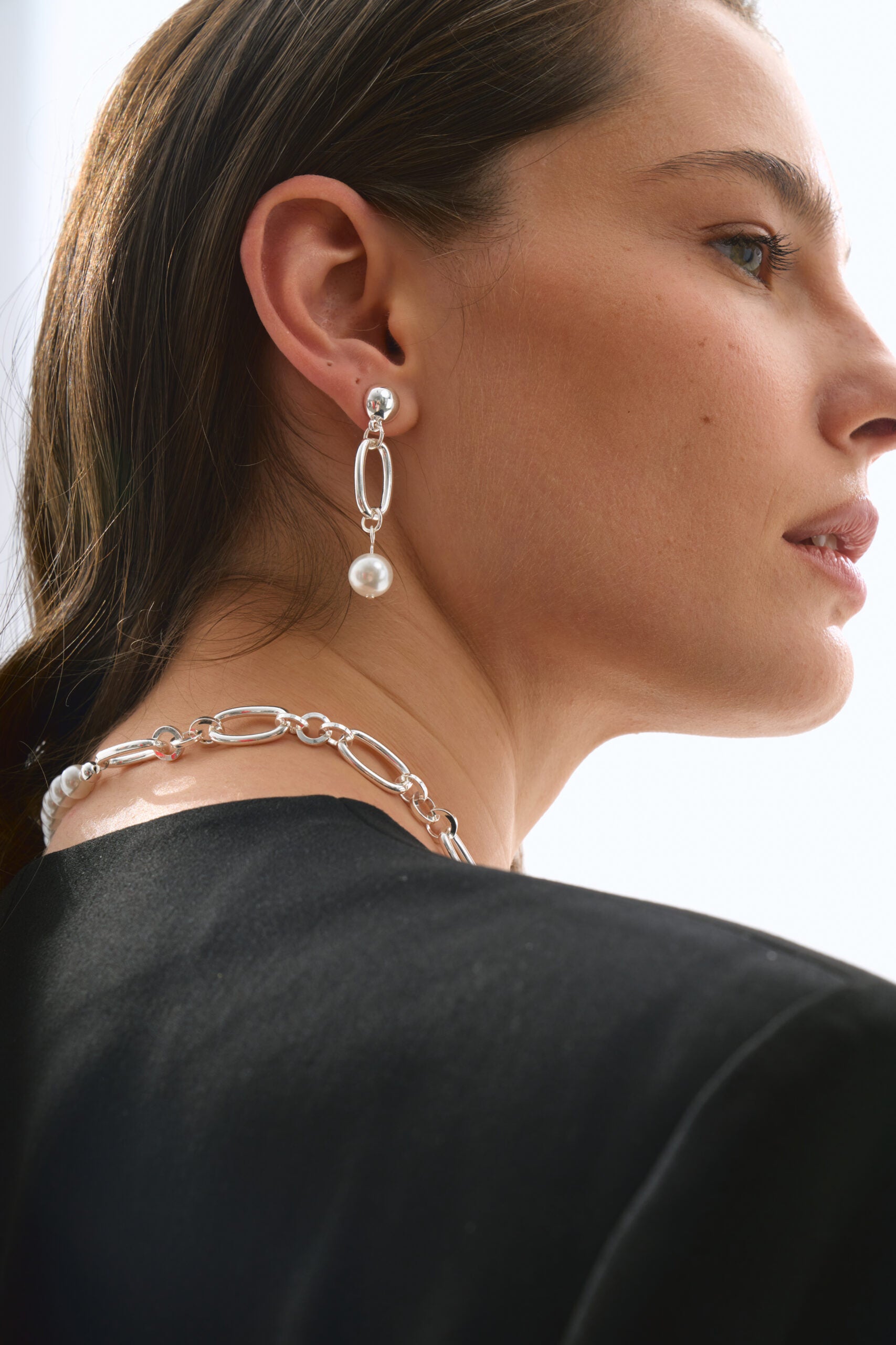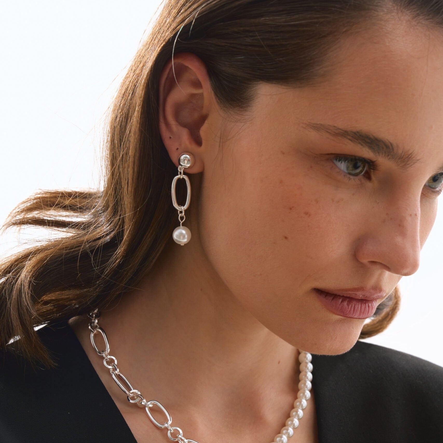 Вишукані сережки з перлинами на ланцюжку випромінюють ніжність і шарм. Їх динамічний дизайн дозволяє перлинам граційно рухатися при кожному вашому кроці, додаючи образу нотку грайливості та розкоші. Довжина ланцюжка створює ефект витягнутості, роблячи риси обличчя ще виразнішими.