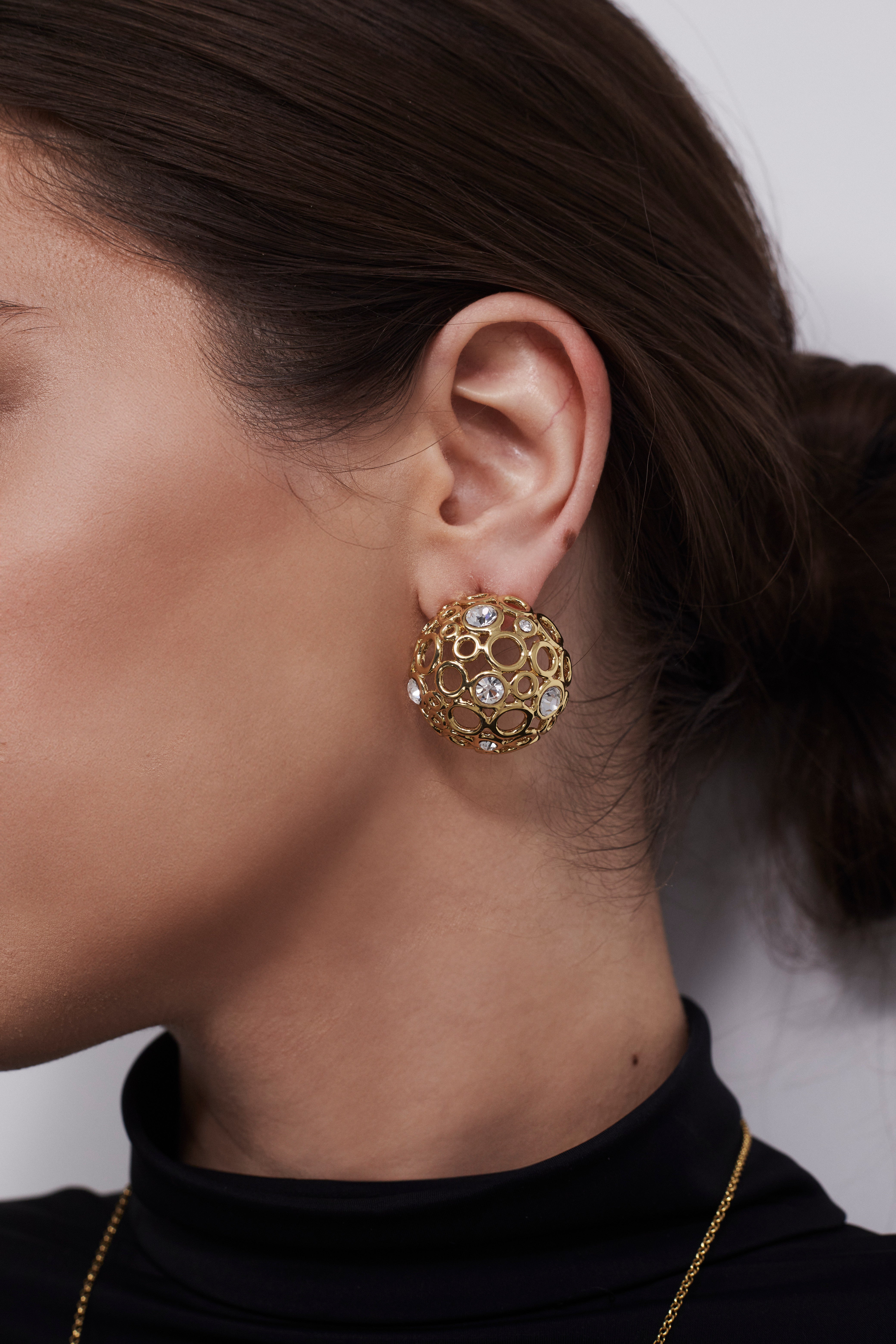 Ці сережки — наче мікропланети, що зберігають у собі світло. Створені для жінки, яка не боїться бути поміченою. Об’єм, вага, блиск — усе про силу й впевненість. Вони не доповнюють образ — вони ним керують.