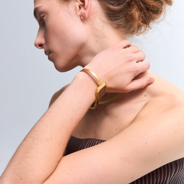 Твердий браслет регульованого розміру із елементом квадратної форми натхненної епохою 60-80х із із неоднорідною, нанесеною вручну емаллю каштанового кольору у покритті позолотою 24К. Незвичний акцент на голе запʼястя (або ж одяг), який додає ноту кольору, зберігаючи класику металу. Гармоніює із чокером та сережками (або кліпсами) із серії RESONANCE Chestnut.