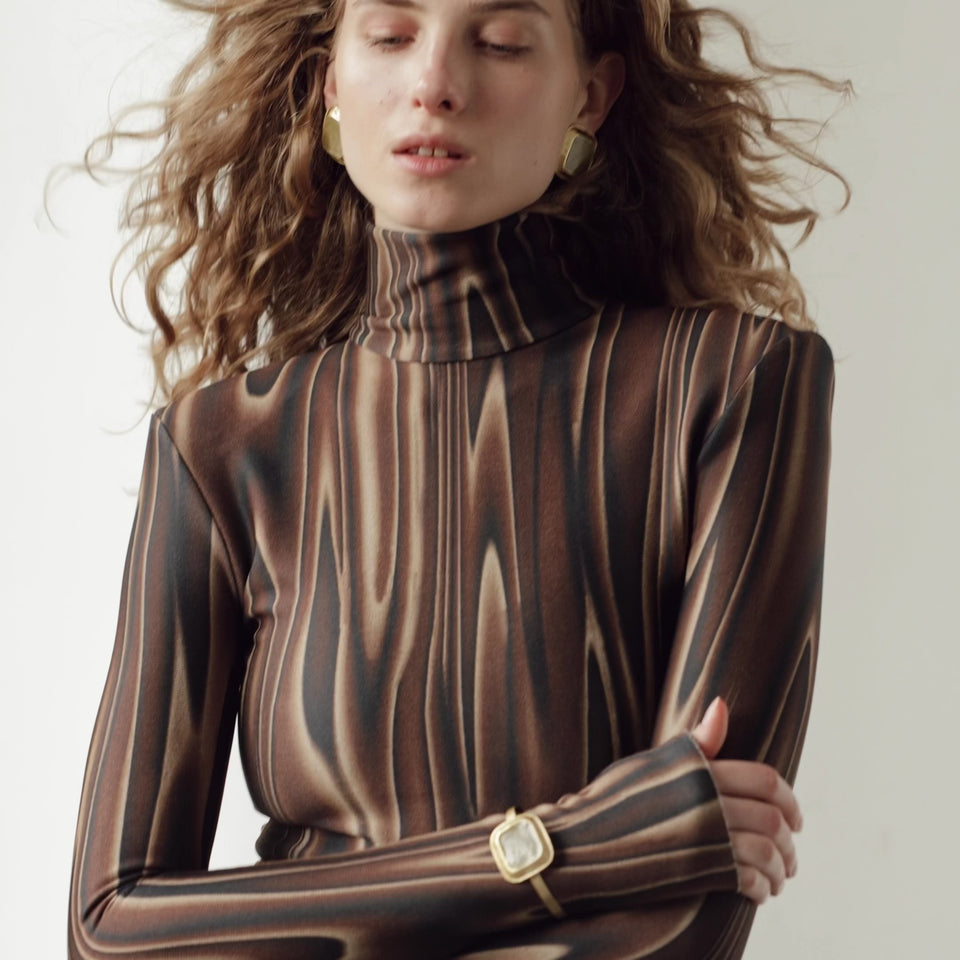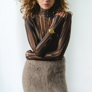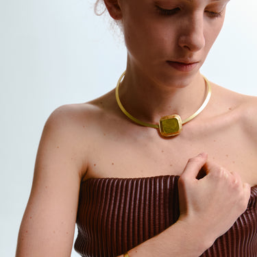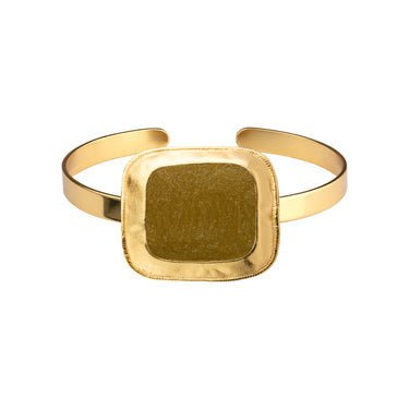 Твердий браслет регульованого розміру із елементом квадратної форми натхненної епохою 60-80х із із неоднорідною, нанесеною вручну емаллю фісташкового кольору у покритті позолотою 24К. Незвичний акцент на голе запʼястя (або ж одяг), який додає ноту кольору, зберігаючи класику металу. Гармоніює із чокером та сережками (або кліпсами) із серії RESONANCE Pistachio.