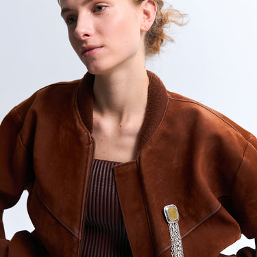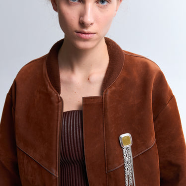 Брошка із неоднорідною, нанесеною вручну емаллю фісташкового кольору в обрамленні натхненної епохою 60-80х квадратної форми та рухливими ланцюжками різної товщини із посрібленням. Класичний акцент на лацкан піджака чи пальто, або ж — нестандартно на сорочку, комір, шарф, сумку тощо.