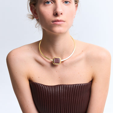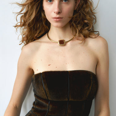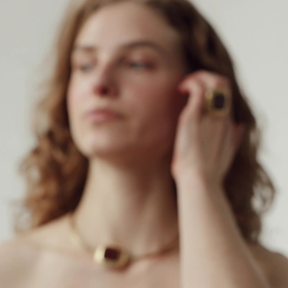 Твердий чокер, що лягає на ключицю із елементом квадратної форми натхненної епохою 60-80х із із неоднорідною, нанесеною вручну емаллю каштанового кольору. Покриття позолотою 24К робить прикрасу теплим акцентом для портретної зони, який ідеально доповнюється браслетом із тієї ж серії RESONANCE Chestnut, а для образів, ще більш у вінтажному дусі додайте сережки (або кліпси).