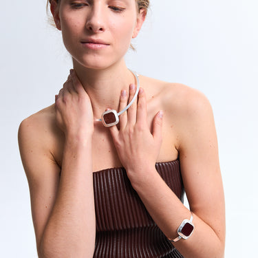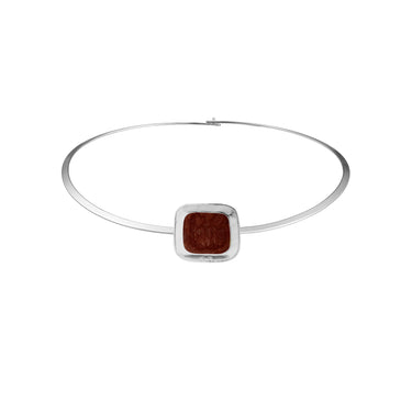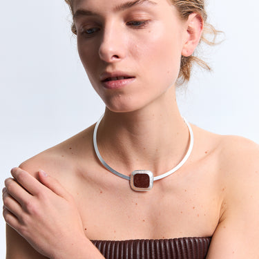 Твердий чокер, що лягає на ключицю із елементом квадратної форми натхненної епохою 60-80х із із неоднорідною, нанесеною вручну емаллю каштанового кольору. Покриття посрібленням робить прикрасу яскравим акцентом для портретної зони, який ідеально доповнюється браслетом із тієї ж серії RESONANCE Chestnut, а для образів, ще більш у вінтажному дусі додайте сережки (або кліпси).