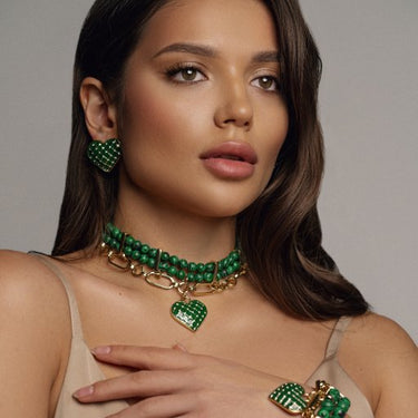 Унікальне кольє з натуральних каменів матового онікса, повністю зібране вручну. Основний вплив мінералу на нервову систему, де він допомагає в боротьбі з депресією, нервовим напруженням, покращує настрій, допомагає зберігати самоконтроль. Серце вручну розписано італійською емаллю з використанням австрійських каменів.