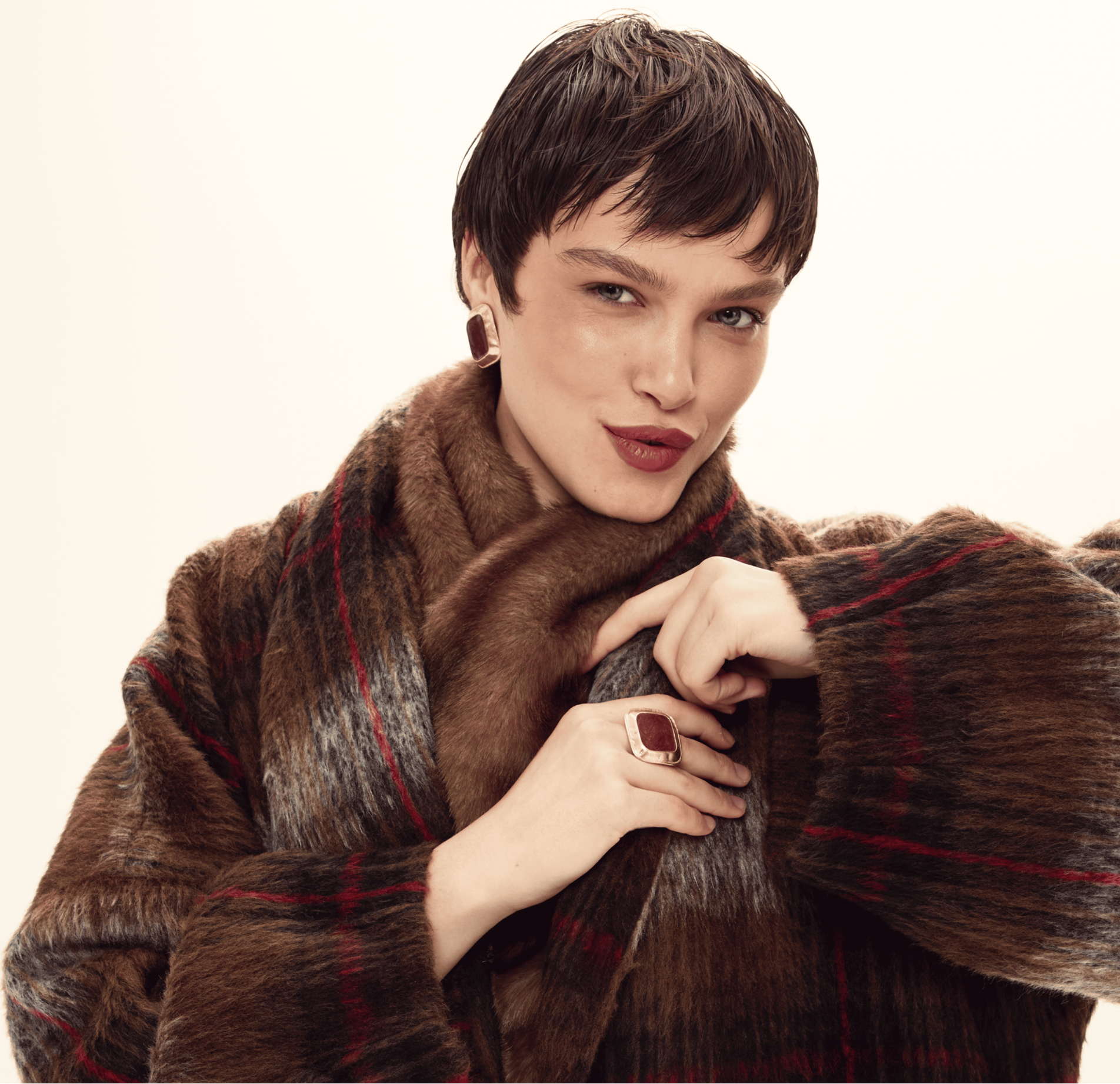 Каблучка регульованого розміру із вже впізнаваним елементом квадратної форми натхненної епохою 60-80х із із неоднорідною, нанесеною вручну емаллю каштанового кольору та позолотою 24К. Гармонійно поєднується із сережками (або кліпсами) з тієї ж серії RESONANCE Chestnut чи іншими прикрасами у портретній зоні — підвісом чи чокером.
