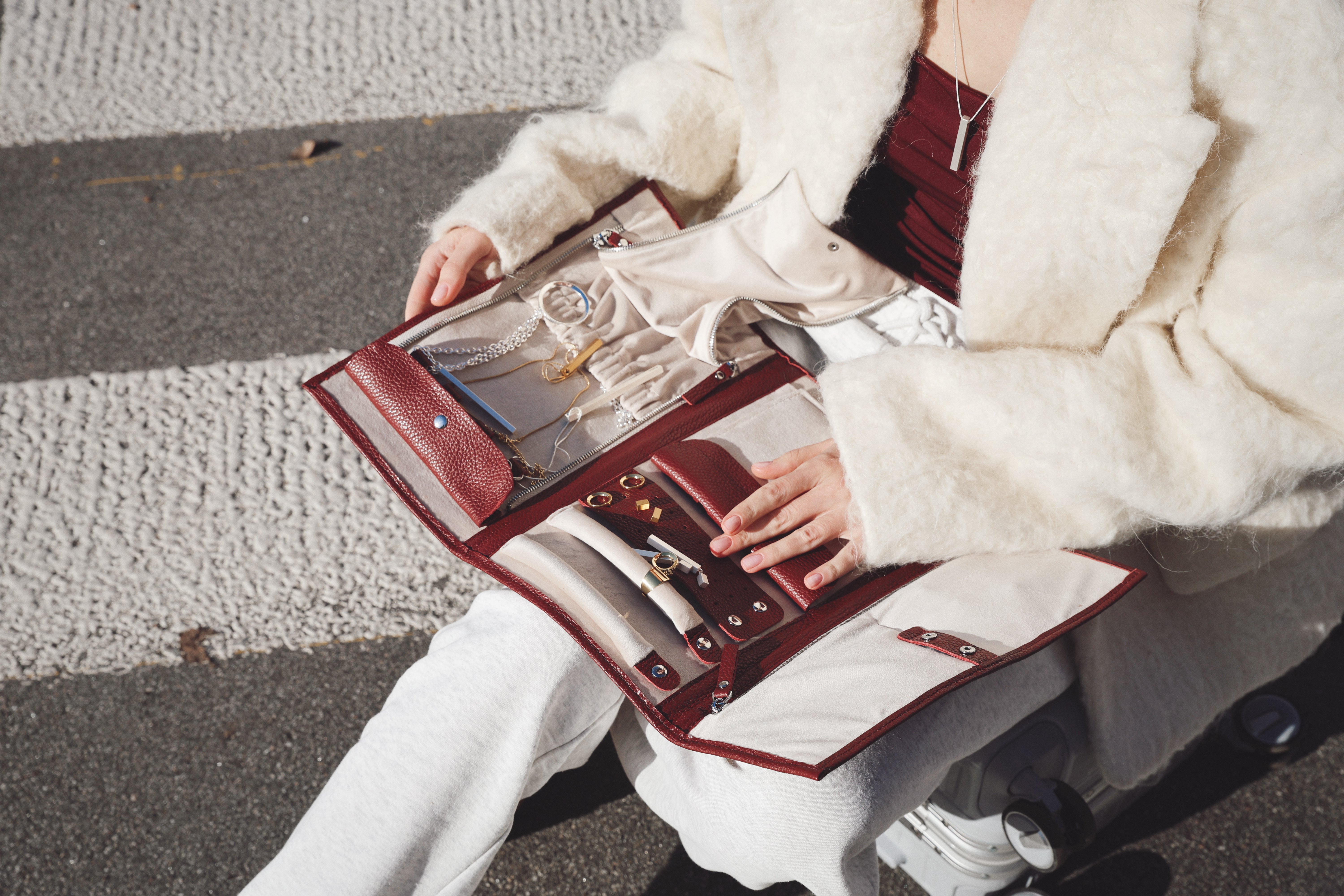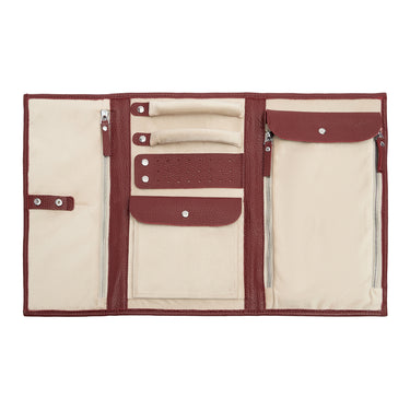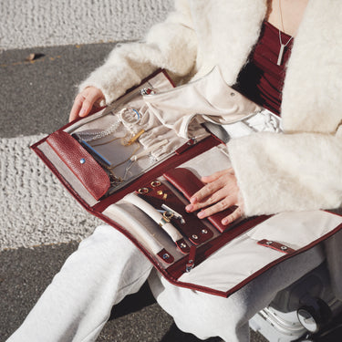 Шкіряний органайзер для прикрас, розроблений у колаборації VENSA x HOLIDAY. Включає шість різних відділень для різного формату прикрас: дві кишені для браслетів, дві смужки для нанизування каблучок, три ряди для сережок, конверт для чокерів, кишеня із гачками для ланцюжків. Оздоблений всередині ніжним велюром, органайзер дбає, щоб усі прикраси були в безпеці від подряпин, а продумана система застібок забезпечує надійне кріплення.