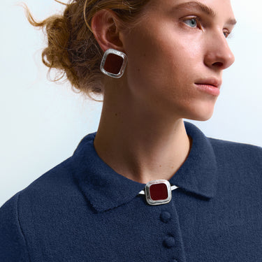 Сережки із неоднорідною, нанесеною вручну емаллю каштанового кольору в обрамленні натхненної епохою 60-80х квадратної форми із посрібленням. Підкреслюють зелені та блакитні очі, а карим додають глибини. Для мінімалістів — поєднання із каблучкою чи браслетом із тієї ж серії RESONANCE Chestnut, а для більш насичених образів додайте ще чокер.