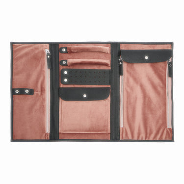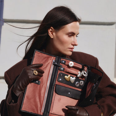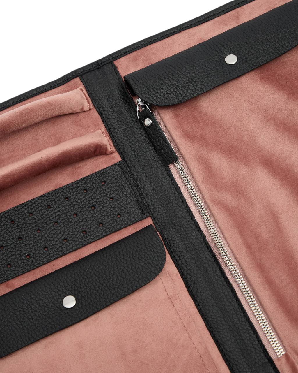 Шкіряний органайзер для прикрас, розроблений у колаборації VENSA x HOLIDAY. Включає шість різних відділень для різного формату прикрас: дві кишені для браслетів, дві смужки для нанизування каблучок, три ряди для сережок, конверт для чокерів, кишеня із гачками для ланцюжків. Оздоблений всередині ніжним велюром, органайзер дбає, щоб усі прикраси були в безпеці від подряпин, а продумана система застібок забезпечує надійне кріплення.
